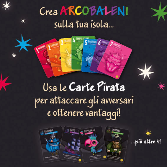 La carta più preziosa di tutte è la carta rainbow pirate che vale 5 punti tesoro e può essere posizionata sulla propria isola da sola o in gruppo.